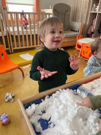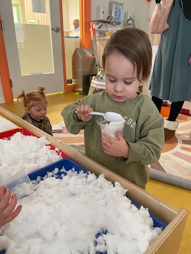 To play, simply set the snow out in a large bowl, tray, or bin and let your child explore freely. You can enhance the experience by adding spoons, cups, or scoops, small containers or molds. In our classrooms, the kids loved when we added toy animals and menchies for pretend winter play. Children naturally take the lead by pouring, building, squishing, and using their imagination as they explore the texture and possibilities of the snow!